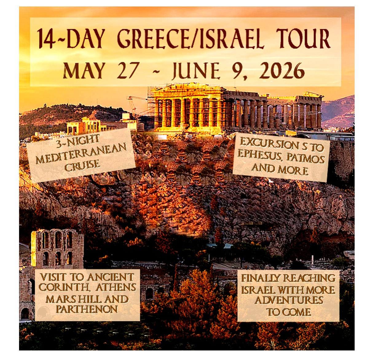 Be sure to set the dates of May 27 – June 9, 2026 in your Calendar. This is a trip you don’t want to miss. Enjoy a 3 night cruise, visiting Ephesus, Patmos, and more! Check out the attached Itinerary to learn all the wonderful places this trip will be visiting, just click the button below to view or download the PDF of Itinerary.